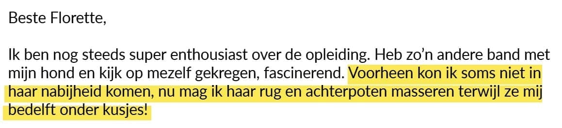 Enthousiast, open en liefdevol. Door haar ervaring in de hondenbrache heeft Florette heel veel kennis verzameld voor het Animal Design. Ik heb het als ontzettend fijn ervaren om van Florette les te krijgen. Florette is een kundige trainer. Duidelijk, geduldig en met veel liefde deelt ze haar kennis en haar passie werkt aanstekelijk. Door praktijkvoorbeelden gaat de stof ook echt leven. Ik ben dan ook heel blij met Florette in mijn netwerk.